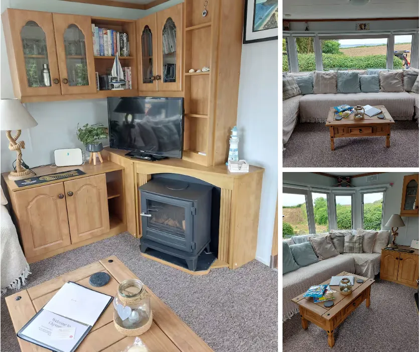 Thoughtful touches like soft throws, cushions, and an electric wood-effect heater create a warm and relaxing atmosphere, perfect for unwinding after a day exploring the Cornish coastline.