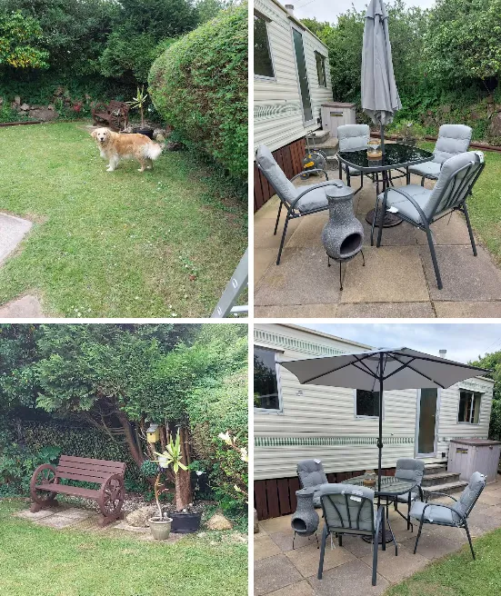 The outdoor area is furnished with patio chairs, a table and a wooden bench for two, offering plenty of space to unwind in the fresh Cornish air.